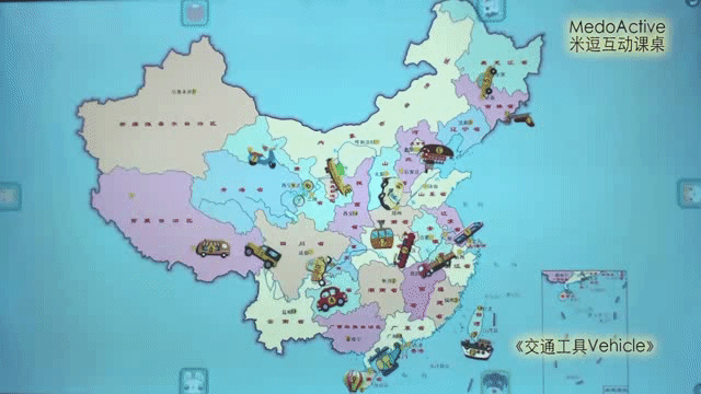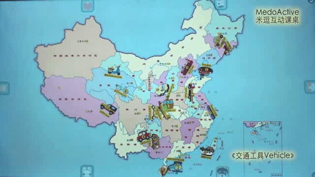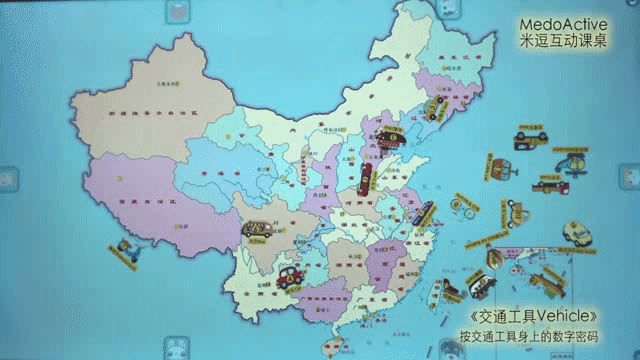 出现在我们眼前的是中国地图。地图上有很多黄色的小圆圈,每个圆圈代表一个地点。点点小圆圈,可以听见地点名称,小朋友可以跟着读一读。